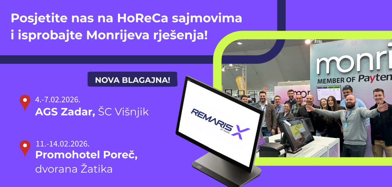 Monri predstavlja svoja najnaprednija rješenja za 2026. godinu za HoReCa sektor na dva ključna sajma u Hrvatskoj – AGS u Zadru i Promohotel u Poreču. Pozivamo ugostitelje, hotelijere i sve profesionalce iz industrije da nas posjete, isprobaju rješenja uživo i dožive kako izgleda moderno, jednostavno i učinkovito vođenje ugostiteljskog poslovanja.