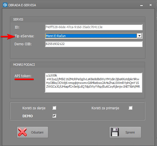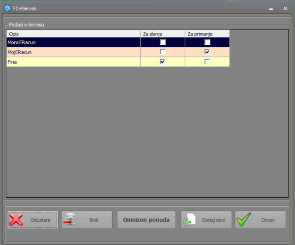 U kojem biramo tip eServisa (moj-eRačun, FINA, Monri E-Račun) te imamo mogućnost odabira hoće li se odabrani eServis koristiti za slanje ili primanje e-računa.