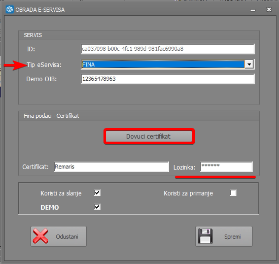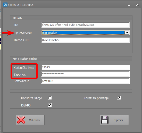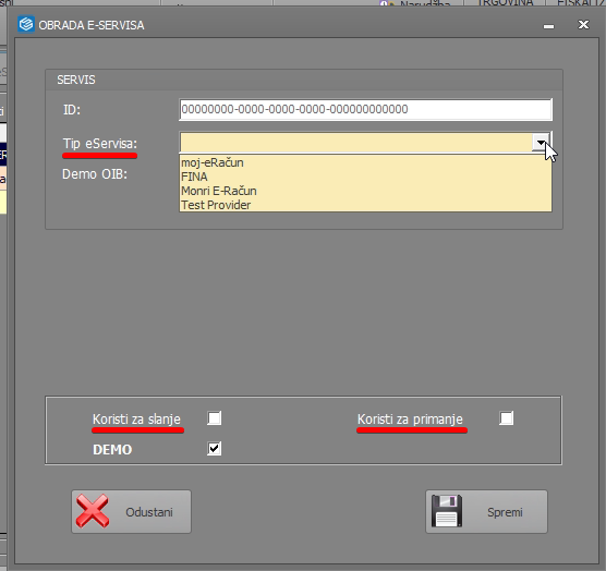 Ako se servis koristi za slanje računa označiti KORISTI ZA SLANJE i sve spremiti.