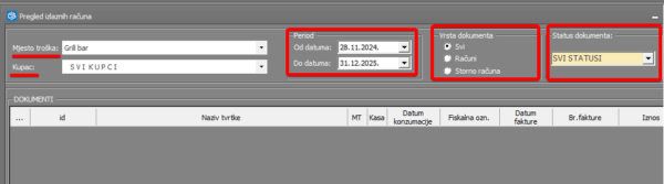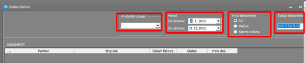 Nalazi se novi prozor unutar koje također biramo kriterije za prikaz računa prema pružatelju usluge, periodu, vrsti dokumenta i statusu dokumenta: