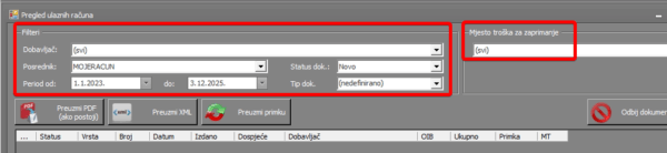 Otvara se novi prozor sa pregledom ulaznih računa u kojem je moguće prikazati račune ovisno o zadanim filterima poput: dobavljači, posrednik, status, period (od/do), tip dokumenta, mjesto troška: