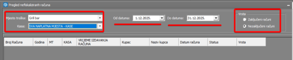 Otvara nam se prozor sa pregledom nefiskaliziranih računa unutar kojeg je također potrebno odrediti parametre poput: mjesta troška, kasa, datum (od/do), vrsta računa: