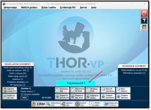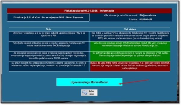 Klikom na FISKALIZACIJA 2.0 na početnom ekranu Thora moguće je ugovaranje usluge Monri eRačun, bez obzira na to što već posjeduje MeR podatke.