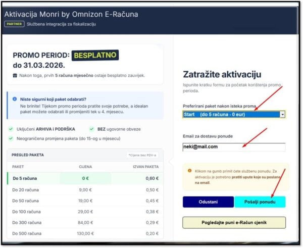 Unutar ovog prozora korisnicima je sa lijeve strane vidljiv pregled paketa te osnovne informacije o ponudi. Sa desne strane se može odabrati preferirani paket iz padajućeg izbornika te upisati e-mail adresu za dostavu ponude. Ukoliko već postoji upisani mail, on se povlači iz postavki programa, ali ga je moguće i ručno upisati. Zatim, na mail se dobije uputa kako dalje nastaviti aktivaciju usluge.