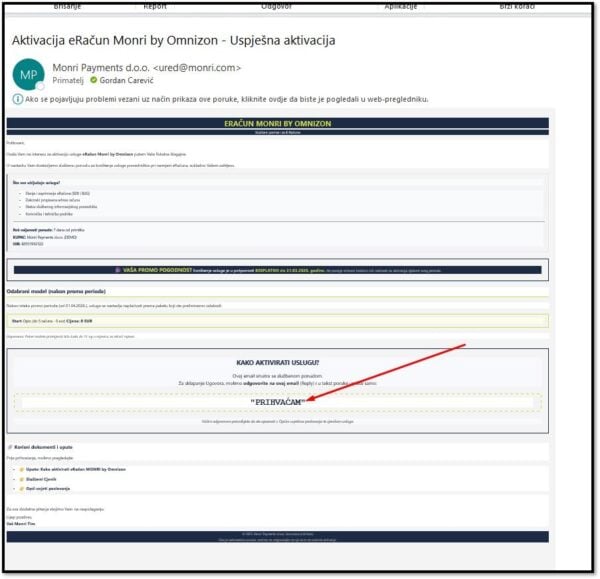 Zatim, korisnik dobije mail sa uputama kako dalje nastaviti aktivaciju usluge. Odgovara sa PRIHVAĆAM itd: