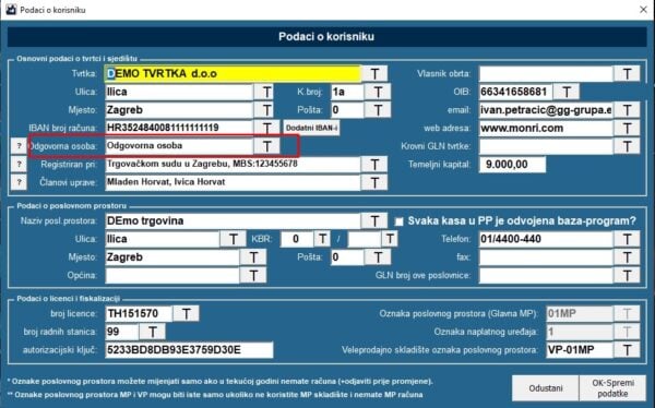 · U izborniku Servis – Postavke programa – Podaci o korisniku – Izmjena podataka upisati odgovornu osobu: