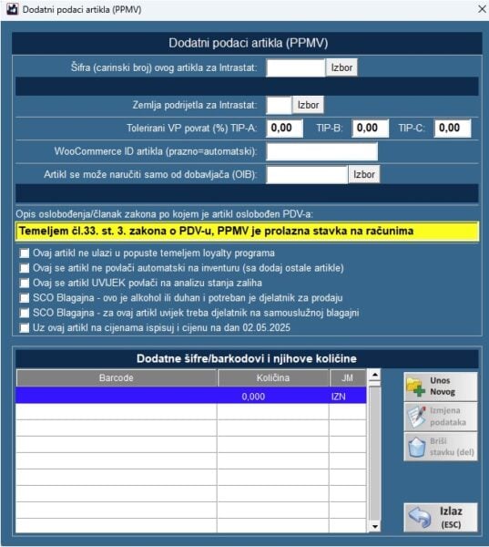 Kod definiranja ostalih podataka artikla i dodatnih šifri (ean kodova) je dodana mogućnost da se za artikl definira članak zakona temeljem kojeg isti ne podliježe PDV-u. Ovo je potrebno unijeti za SVE artikle usluge ili robe koji su unutar porezne grupe “UBP” ili “RBP” (usluga ili roba bez poreza), a kako bi se isti ispravno slali u sustav e-Računa.