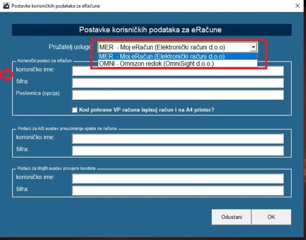 Potrebno je upisati i izabrati svog pružatelja usluge za eRačune. To se može napraviti na način da se klikne na izbornik Servis – Postavke programa – Postavke eRačuna. Izabirete pružatelja usluge i upisujete korisničke podatke koje ste dobili od svog pružatelja usluge za eRačune.