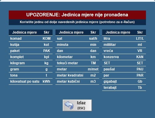 Kod unosa i definiranja jedinice mjere za neki proizvod dodana je provjera da li je unesena jedinica prema važećim standardima, a zbog usklade sa e-Računima. Ukoliko jedinica nije u skladu sa standardima, program će prikazati obavijest sa poželjnim jedinicama mjere. Ukoliko ipak ne unesete jednu od tih jedinica mjere, kada ćete slati e-Račun program će sve tretirati kao “KOM” – Komad.