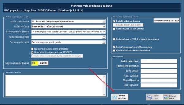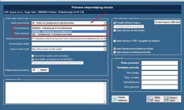 - B2B Račune prema pravnim osobama je moguće fiskalizirati prema fiskalizaciji 1.0 ili 2.0 (eRačun), kao na slici