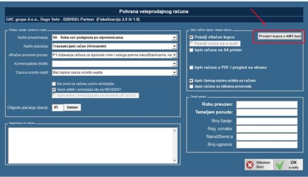 Na kraju VP računa, kod pohrane, dodana je mogućnost provjere da li je kupac registriran u AMS bazi podataka porezne uprave, odnosno da li mu možete poslati račun. Ova je provjera aktivna tek od 01.01.2026. godine, a u međuvremenu služi ako bi neki od pružatelja usluge eRačuna omogućio provjeru i prije tog datuma.